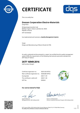 ㈜두산의 품질 목표는 완벽한 품질보증을 통한 불량유출 Zero, 한계품질 극대화를 통한 고품질 달성, 통계적 공정 관리를 통한 균일품질 확보, 원자재로 인한 공정/고객불량 Zero, 전 직원 품질의식 확보를 통한 품질문화 구축이며, 이를 위해 IATF 16949, ISO 9001에 기반한 품질경영시스템을 운영하고 있으며, 각 현장에 맞는 표준을 제작하여 배포, 준수하고 있습니다.